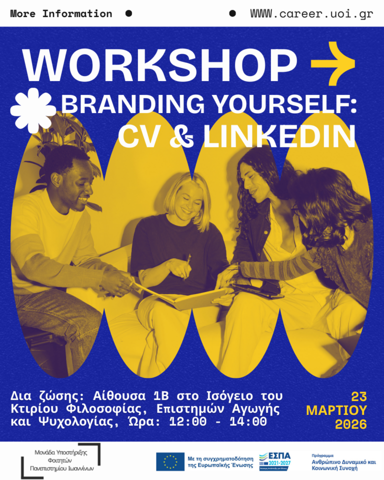 Γενικές ανακοινώσεις Eργαστήριο με τίτλο “Branding Yourself: CV & LinkedIn” – Δευτέρα 23 Μαρτίου 2026 Περισσότερα » 20 Μαρτίου 2026 13:45