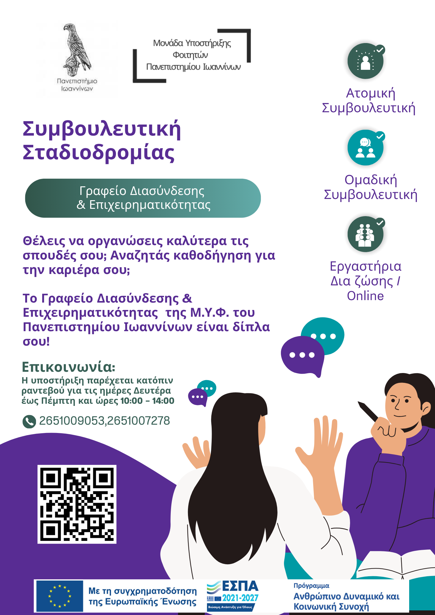 Μια νέα ακαδημαϊκή χρονιά ξεκινάει και η Μονάδα Υποστήριξης Φοιτητών (Μ.Υ.Φ.)- Γραφείο Διασύνδεσης και Επιχειρηματικότητας είναι εδώ για να υποστηρίξει τους φοιτητές/ριες και απόφοιτους του Πανεπιστημίου Ιωαννίνων σε θέματα σταδιοδρομίας.